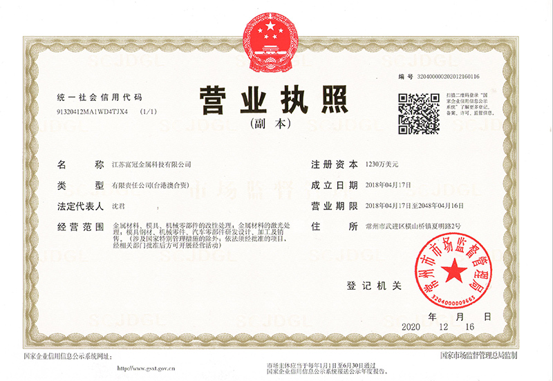 江蘇富冠金屬科技有限公司(以下簡稱:“公司”)成立于2018年4月,隸屬于鑫昌泰集團,是常州市經開區招商引資的重點外資企業,注冊資本1230萬美元,座落于常州市經開區橫山橋智能裝備產業園,占地面積22762.8平方米,員工總數100人。公司主要經營:金屬材料、模具、機械零部件的改性處理;金屬材料的激光處理;模具鋼材、機械零件、汽車零部件研發設計、加工及銷售。并具有真空淬火、普通淬火、調質、去應力回......